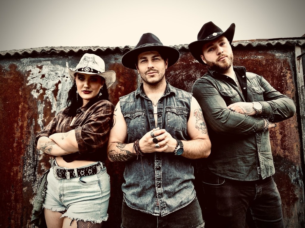 [Image Description: Three individuals with a Western look stand against a rusted metal wall. The woman on the left wears a white cowboy hat, plaid shirt, and denim shorts, with bold makeup and tattoos. The center man sports a black cowboy hat, sleeveless denim vest, and rings, showing tattooed arms. The man on the right, also in a black hat, wears a dark shirt and jeans, standing with arms crossed, his tattoos visible. ]
